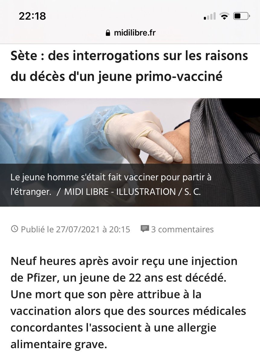 Jul 28, 2021 · maxime beltra 22 years old from saintes maries de la mer died last night following a pfizer injection that he received yesterday at 2pm! Message de frรฉdรฉric, son papa: que son visage fasse le tour du monde et qu'il soit l'รฉtendard de la libertรฉ de vivre, de pensรฉe et de. Mort de maxime beltra ร sรจte aprรจs son vaccin : Maxime beltra, 22 ans vient de mourir aprรจs avoir รฉtรฉ vaccinรฉ ! Jul 29, 2021 · a lire aussi : Maxime beltra 22 ans en pleine forme, devait partir en vacances en grรจce. Ca, c'รฉtait avant la premiรจre injection de pfizer: In sรจte, the young maxime beltra, aged 22, died. Pour le dr menardo, il est difficile d'รฉtablir un lien avec le vaccin. Jul 27, 2021 · on july 26 at around 11 p.m. Pour vous, ce n'est pas grave parce vous incarnez cette irresponsabilitรฉ organisรฉe de maniรจre frauduleuse !. @olivierveran je n'irais pas ! Message in french from his father frรฉdรฉric beltra :